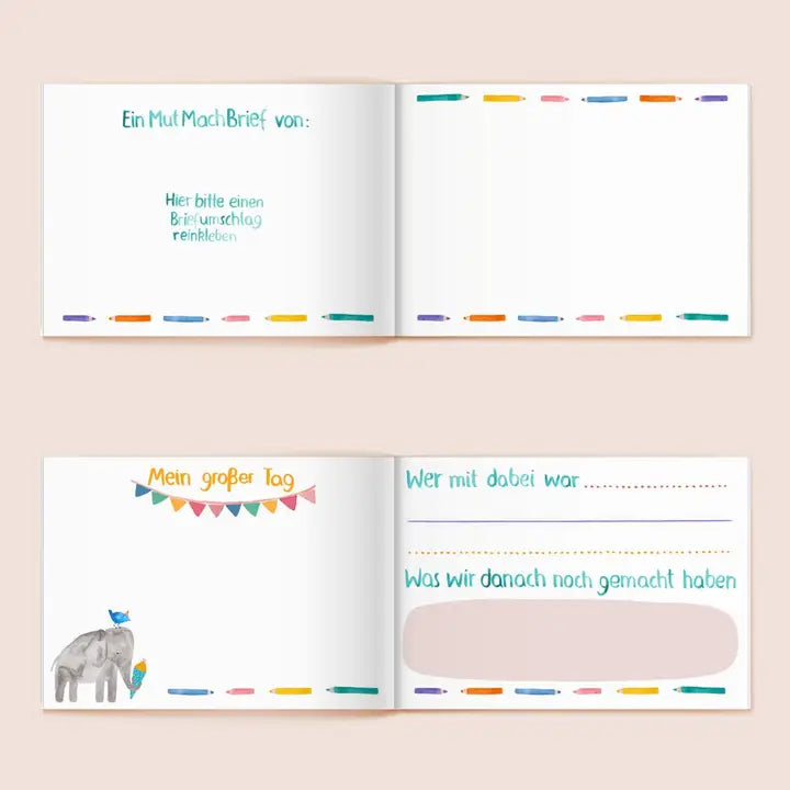 Ein farbenfrohes Einschulungsbuch für alle Kinder, die in die erste Klasse kommen In dem Einschulungsbuch ist Platz für mutmachende Worte, Erinnerungen an den ersten Schultag und Fotos.