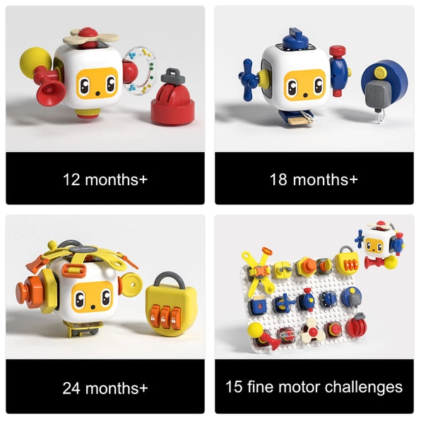 Das lustige Set besteht aus einem kleinen Würfel, einem Steckbrett und 15 spannenden Steckelementen, die Kinder entweder auf den Würfel oder das Brett stecken können.