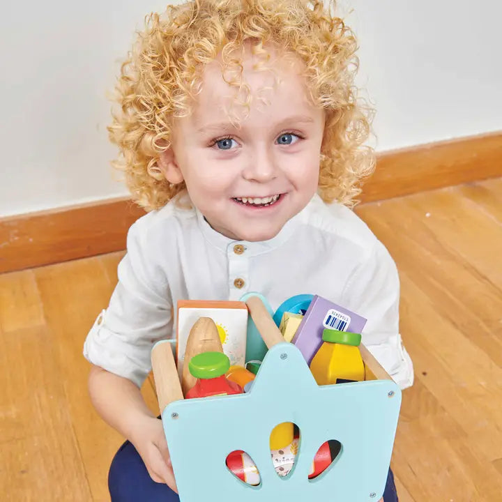 Ein umfangreiches Set in einem Holzkorb und mehr als einem Dutzend Lebensmitteln aus Massivholz sowie einem lustigen Barcode-Scanner und einigen Barcode-Aufklebern.