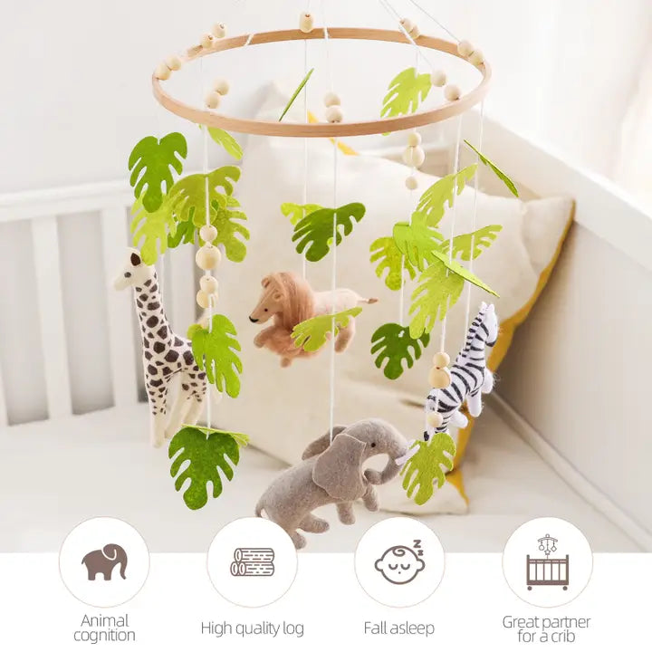 Mit einem natürlichen Holzständer und niedlichen Dschungeltieren – Löwe, Giraffe, Zebra und Elefant – kombiniert dieses Mobile Stil, Funktionalität und Sicherheit.