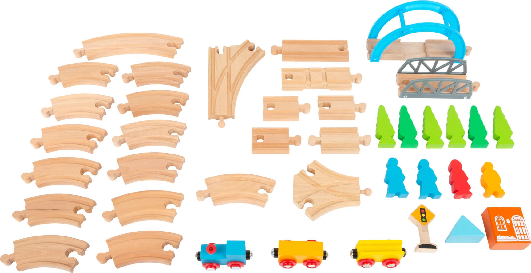 Die Holzschienen sind mit allen handelsüblichen Schienen kompatibel. Dieser kreative Spielspaß darf in keinem Kinderzimmer fehlen.