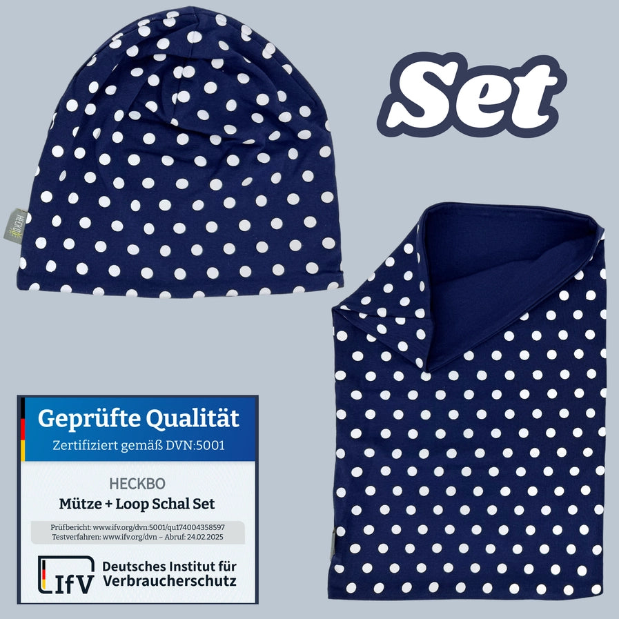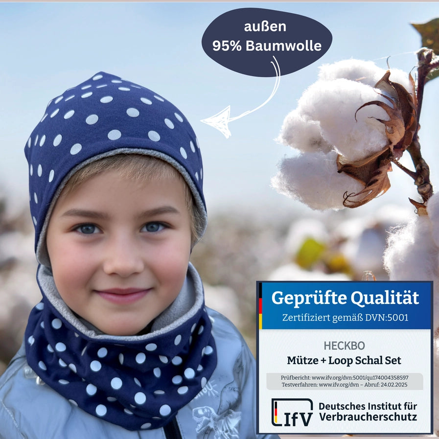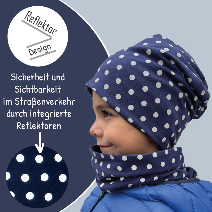 Das moderne HECKBO Mützen-Set mit reflektierenden Punkten ist die perfekte Wahl für Eltern, die ein sicheres, stilvolles und vielseitig kombinierbares Accessoire für ihr Kind suchen.