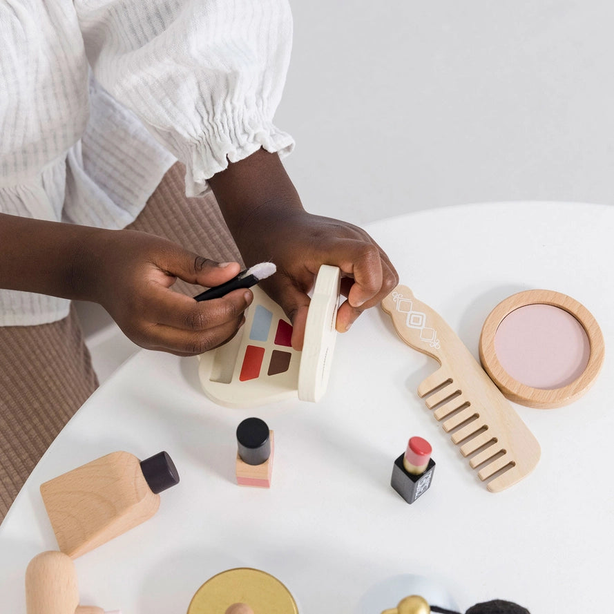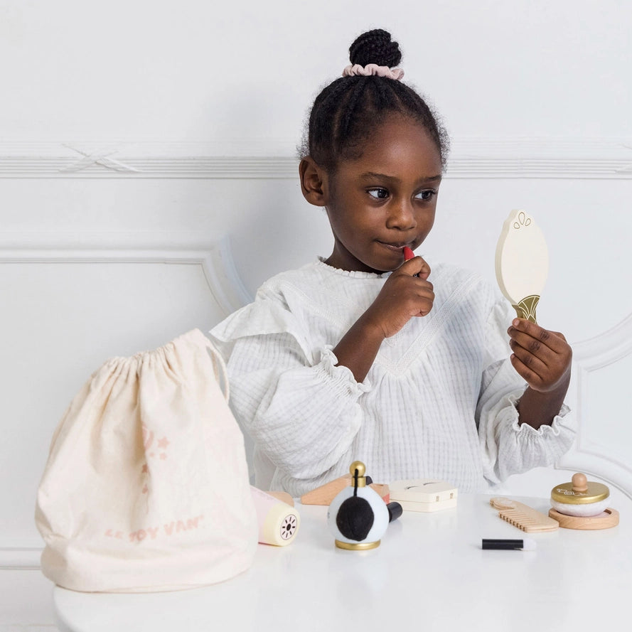 In der Kosmetiktasche befindet sich eine Auswahl an Holzaccessoires, darunter eine Vintage-Parfümflasche mit Zerstäuber, ein Handspiegel, ein Haartrockner, ein Kamm, ein kompaktes Make-up-Set in einer Schale, Lotion, Nagellack, Lippenstift und ein Puderquast aus Baumwolle.