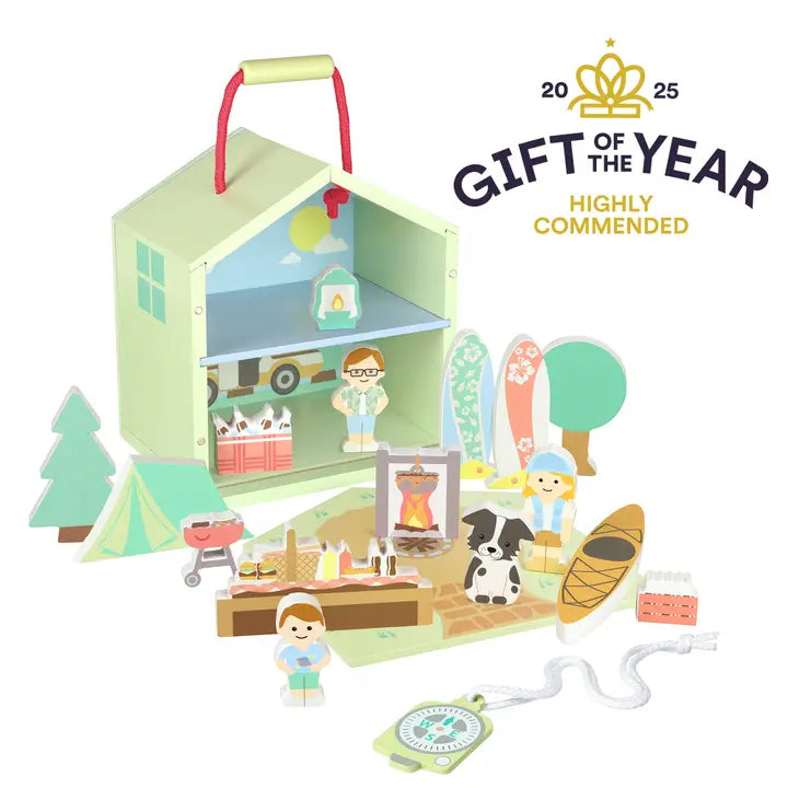 * Packen Sie die ganze Familie ein und machen Sie sich bereit zum Campen mit diesem wunderbaren Camping-Spielset. * Die Rückseite der magnetischen Vorderseite zeigt einen Campingplatz mit einem kleinen Feuer, das bereit ist, Marshmallows zu rösten. * Mit einer ganzen Familie und ihrem Hund, zwei hohen Bäumen, einem Zelt und einer Laterne, einem Lagerfeuer mit einer Mahlzeit, die gekocht wird, einem Grill mit heißen Würstchen und Burgern, die brutzeln, einer Getränkekühlbox mit eiskalter Limonade, einem Tisch voller Essen, einem Zelt, einem Kompass, zwei Surfbrettern für Strandtage und einem Kajak für Flussabenteuer! * Kinder werden es lieben, das Lager aufzubauen und zu lernen, wie viel Spaß die Natur machen kann.