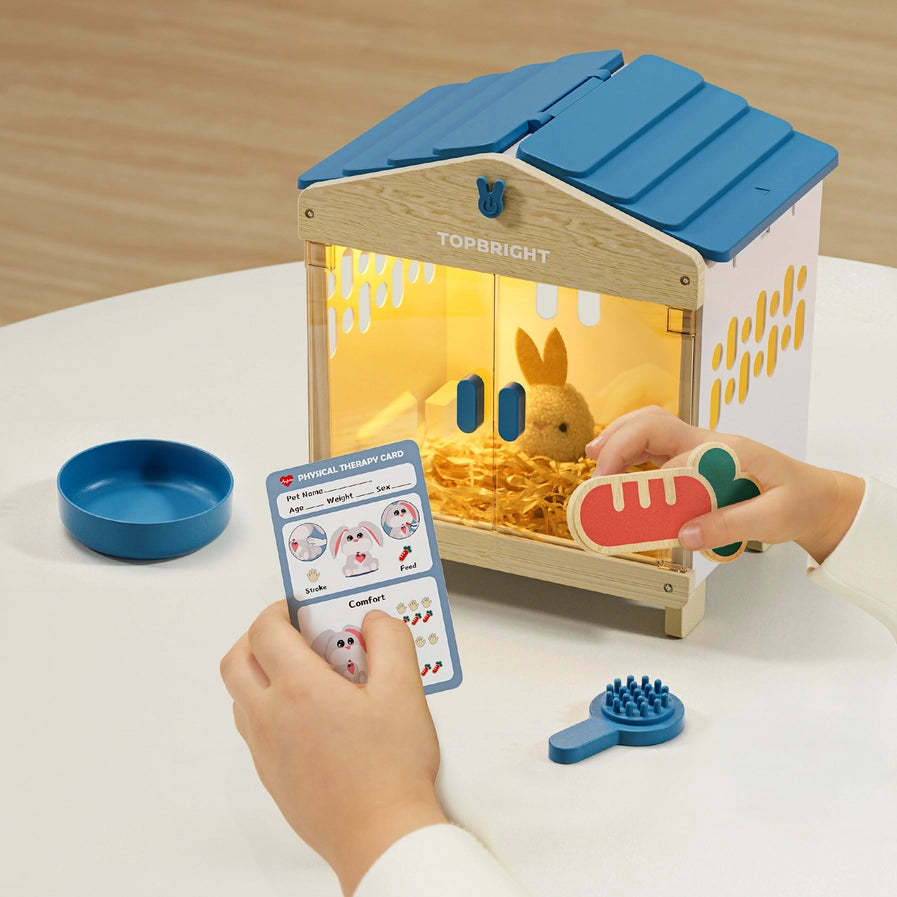 Kinder helfen MUMMY BUNNY, sich besser zu fühlen, mit Hilfe der Diagnosekarte und liebevollen Streicheleinheiten sowie ein paar Bissen von der interaktiven Karotte.
