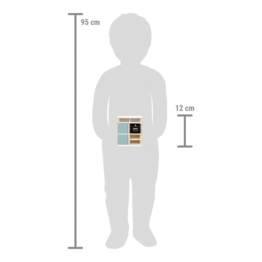 Im Mittelpunkt des umfangreichen Spielsets steht die zeitgemäße Kücheninsel und ein eleganter Hochschrank, ausgestattet mit einer wirklichkeitsnahen Kühl-Gefrierkombination, praktischen Borten und einem Backofen.
