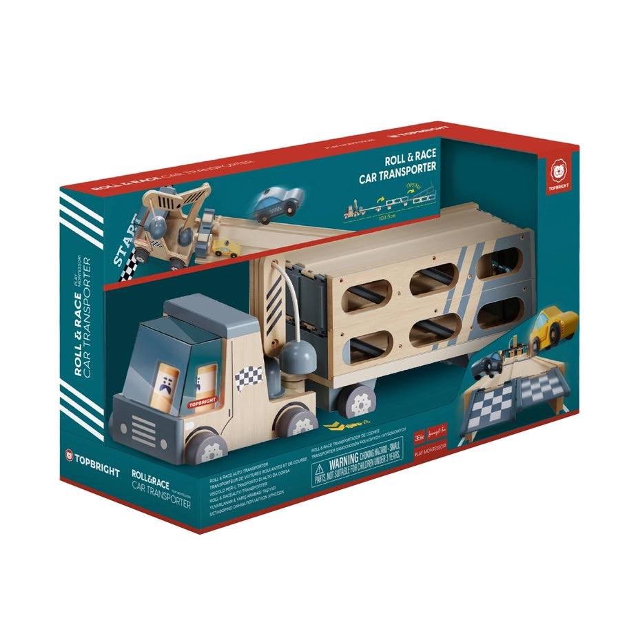 Auf die Plätze, fertig, los! Der Roll & Race Autotransporter von TOPBRIGHT wird junge Autofans ab 36 Monaten begeistern.