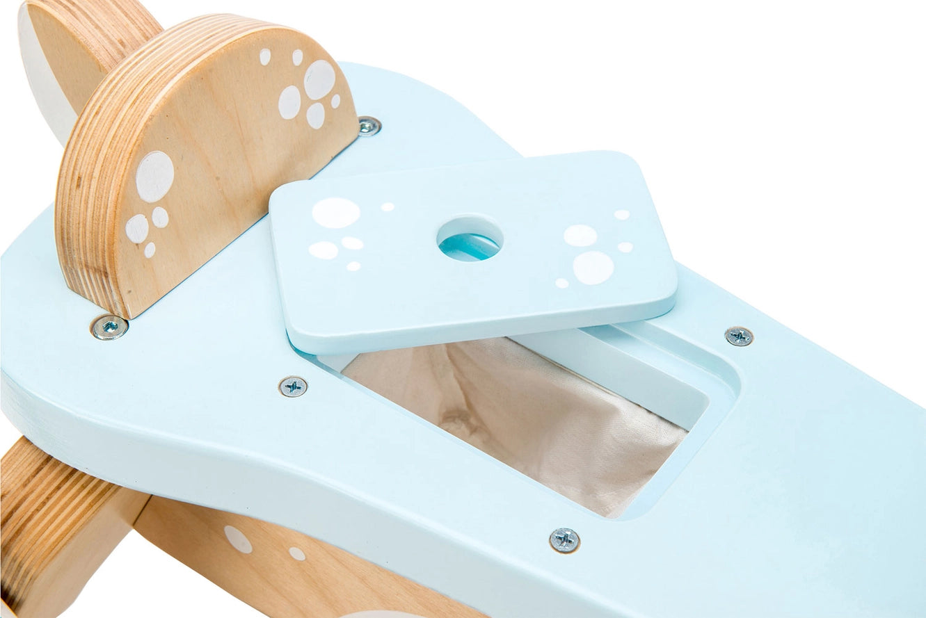 Dieses robuste Gefährt aus Holz verfügt über eine Aufbewahrungstasche.