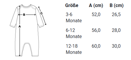 Unsere Größen orientieren sich an gängigen Maßtabellen. Wenn du zwischen zwei Größen liegst, empfehlen wir, die größere zu wählen – so wächst dein Baby bequem hinein.