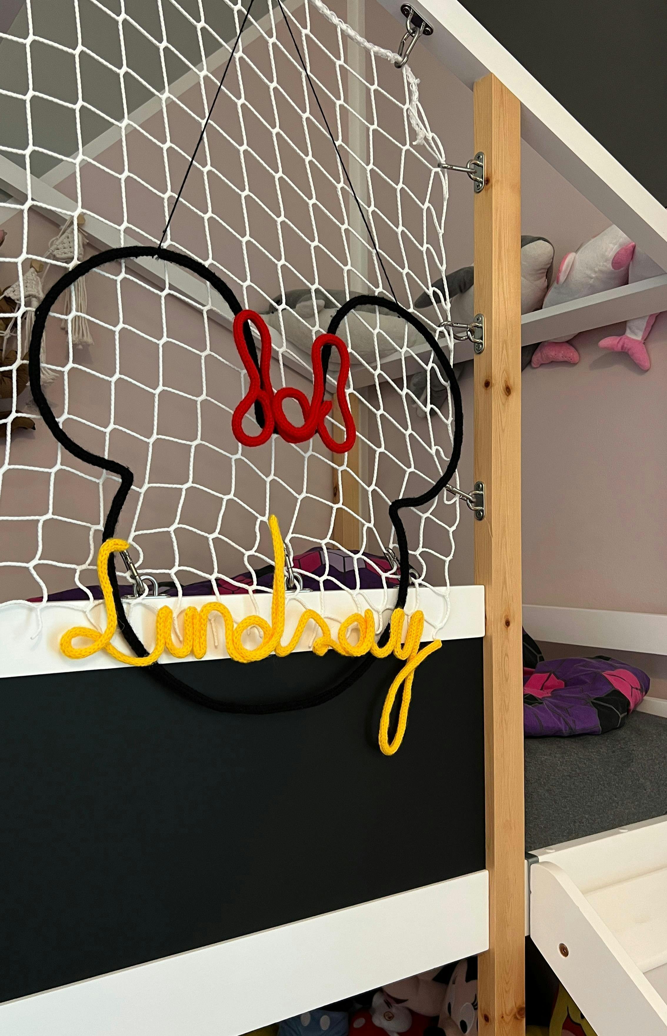 Dieser handgefertigte Wandanhänger aus weichem Garn ist ein echtes Unikat – liebevoll gebogen in Form einer Minnie Mouse mit roter Schlaufe. Der Name deines kleinen Wunders wird kunstvoll eingearbeitet und macht dieses Dekostück zu einem ganz persönlichen Highlight im Kinderzimmer.