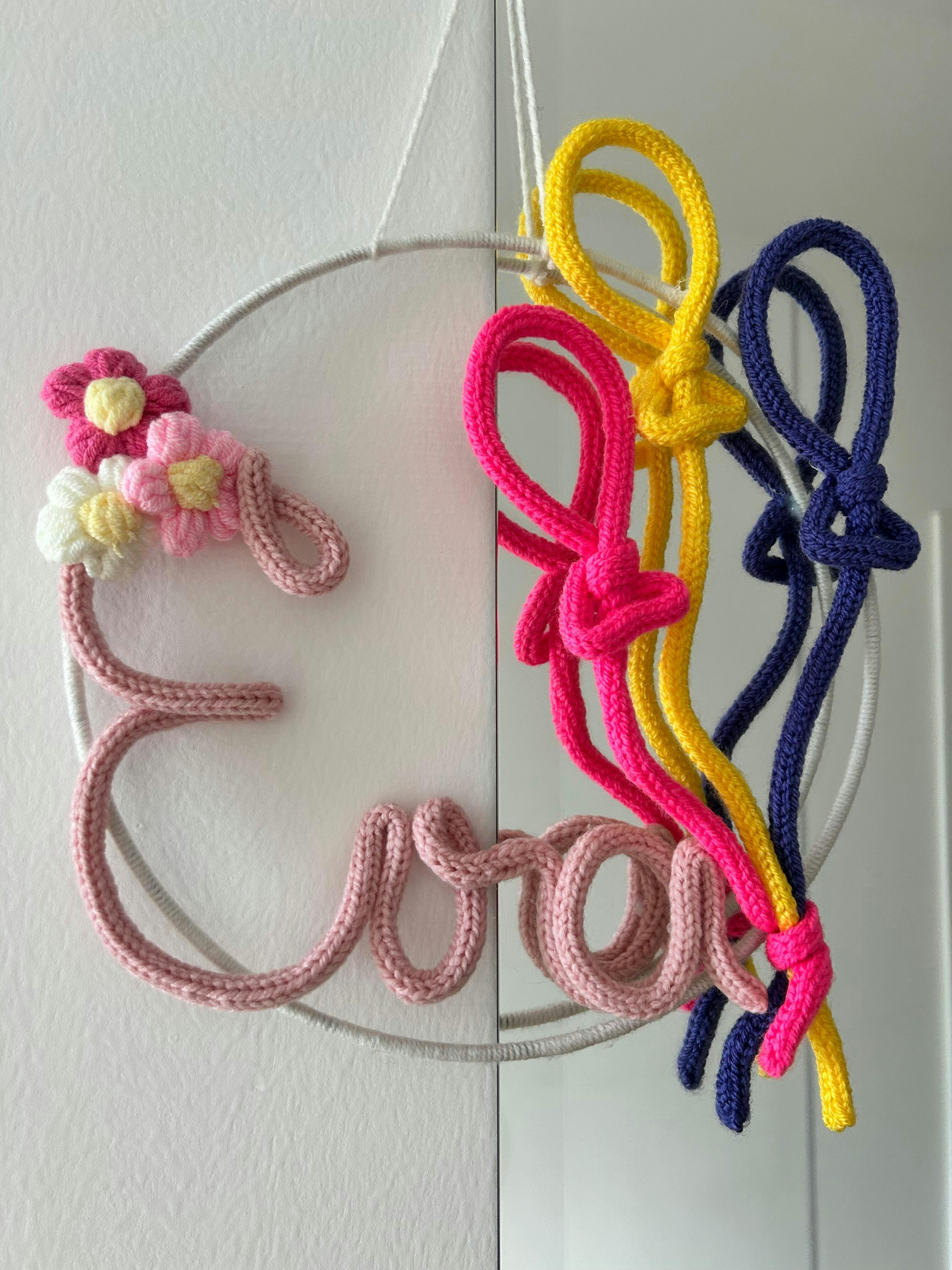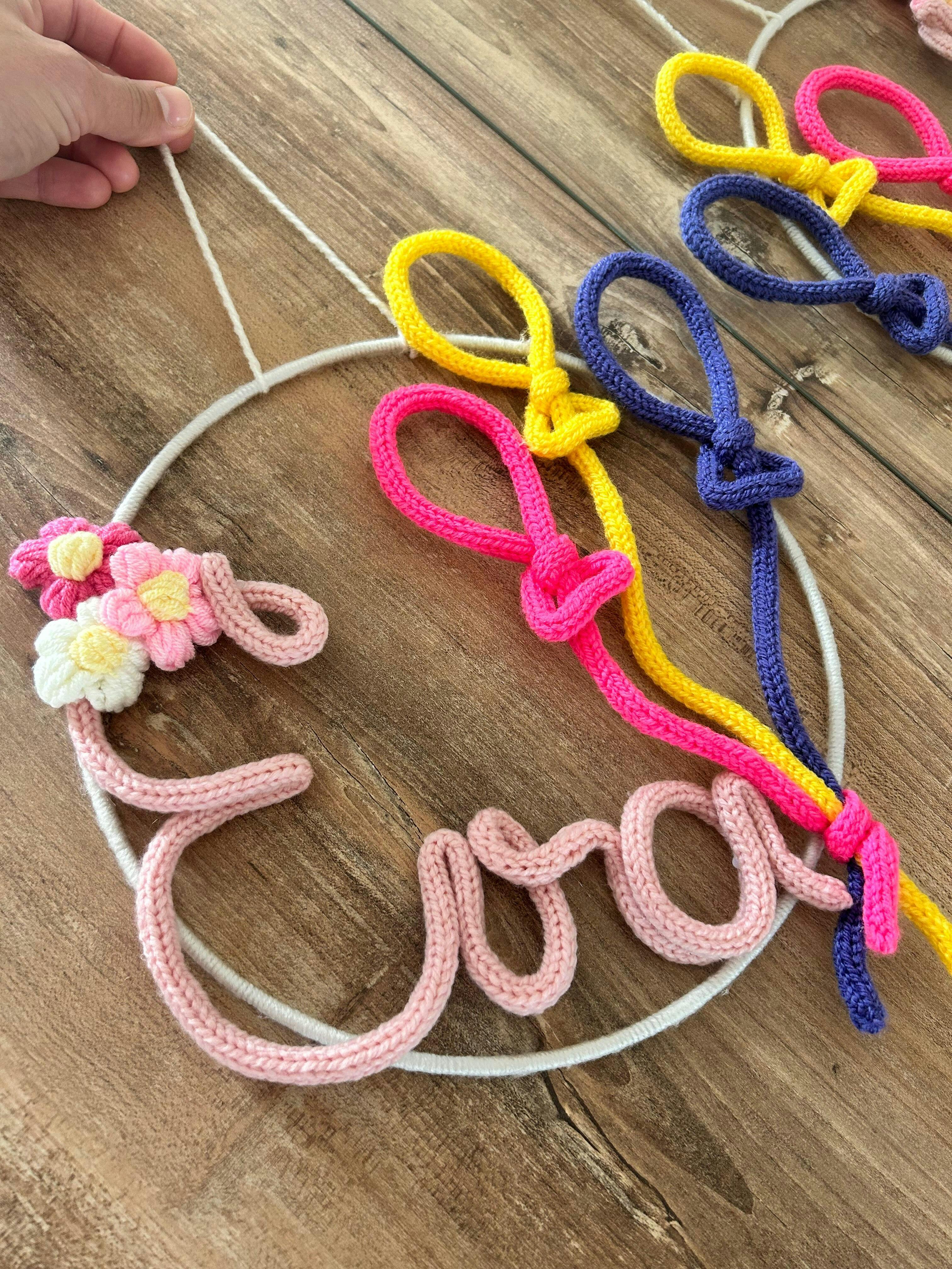 Der Name wird aus weicher Strickkordel geformt und von bunten Ballons sowie süßen Häkelblümchen umrahmt.